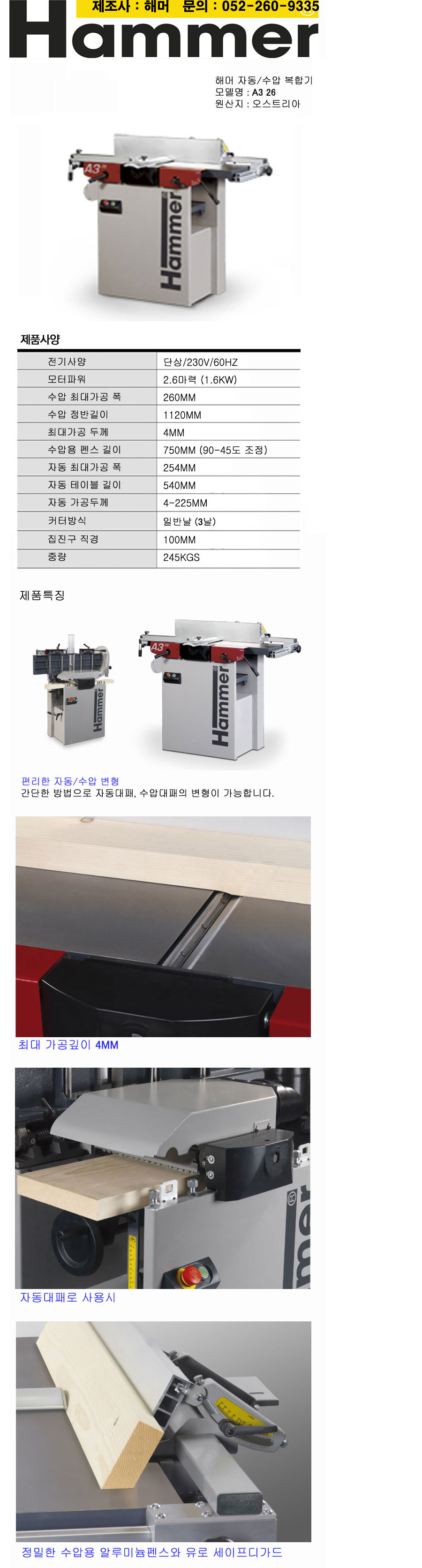 자동수압대패복합기(일반날) A326 해머-HAMMER 이미지 확대 보기